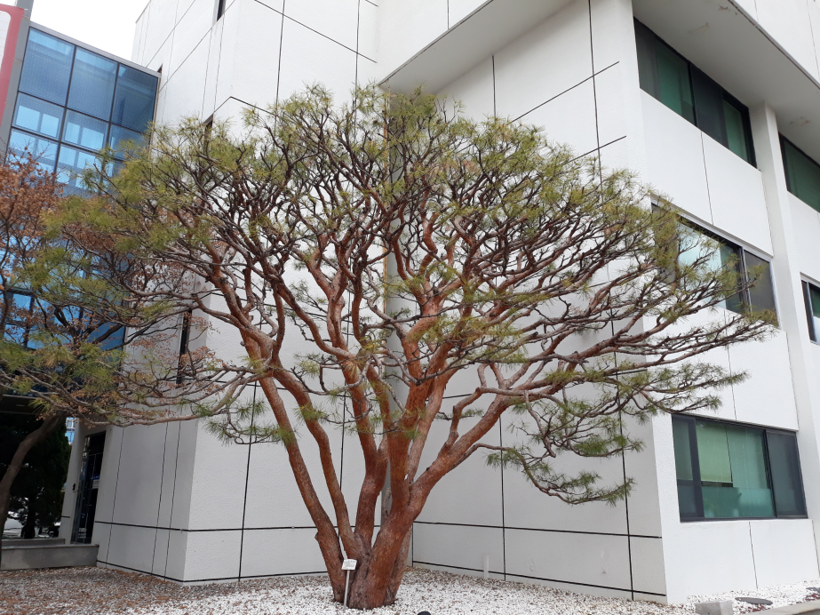 보통 일반적인 소나무는 하나의 줄기로 위쪽으로 하늘을 향해 쭉쭉 뻗어 나갑니다. 그런데 이 소나무는 맨 아래에서부터 여러 줄기로 갈라져서 넓게 퍼져 있었습니다. 소나무의 윗부분은 둥그스름한 모양이었습니다. 우산 모양 같아 보였습니다. 어떻게 보면 왠지 이 나무는 소나무가 아닌 다른 외계의 나무 같아 보이기도 했습니다. 이 나무의 이국적인 모습에 마치 다른 세계로 날아간 것 같은 느낌이었습니다.