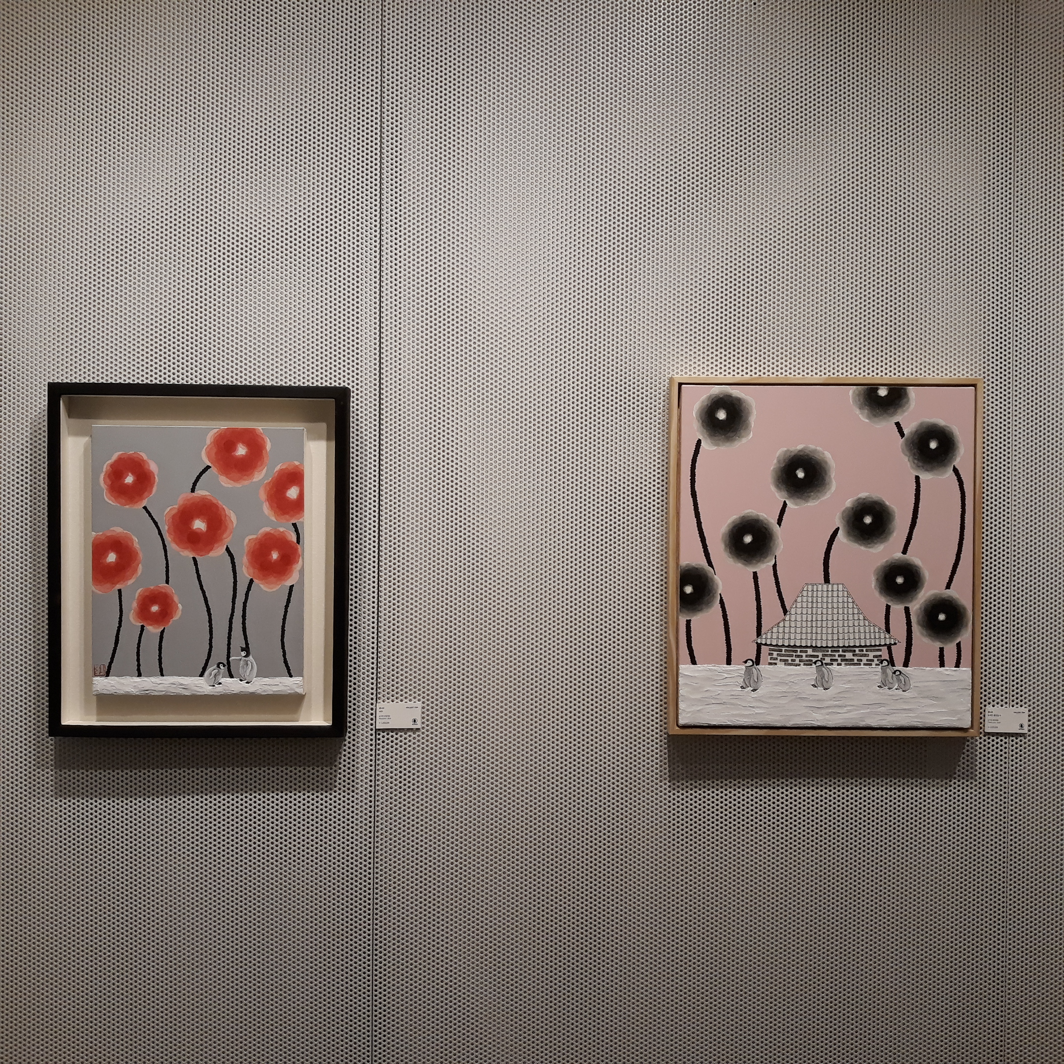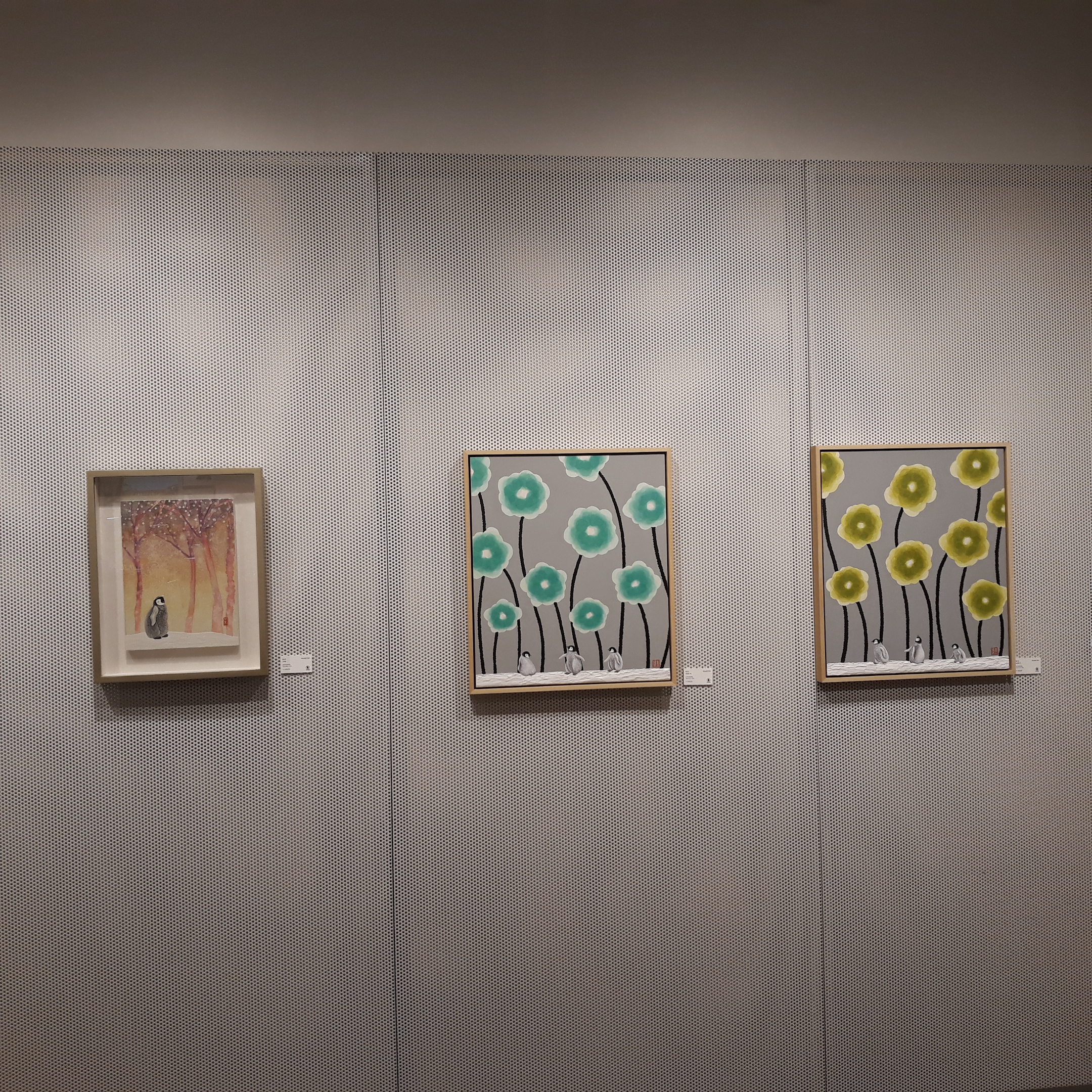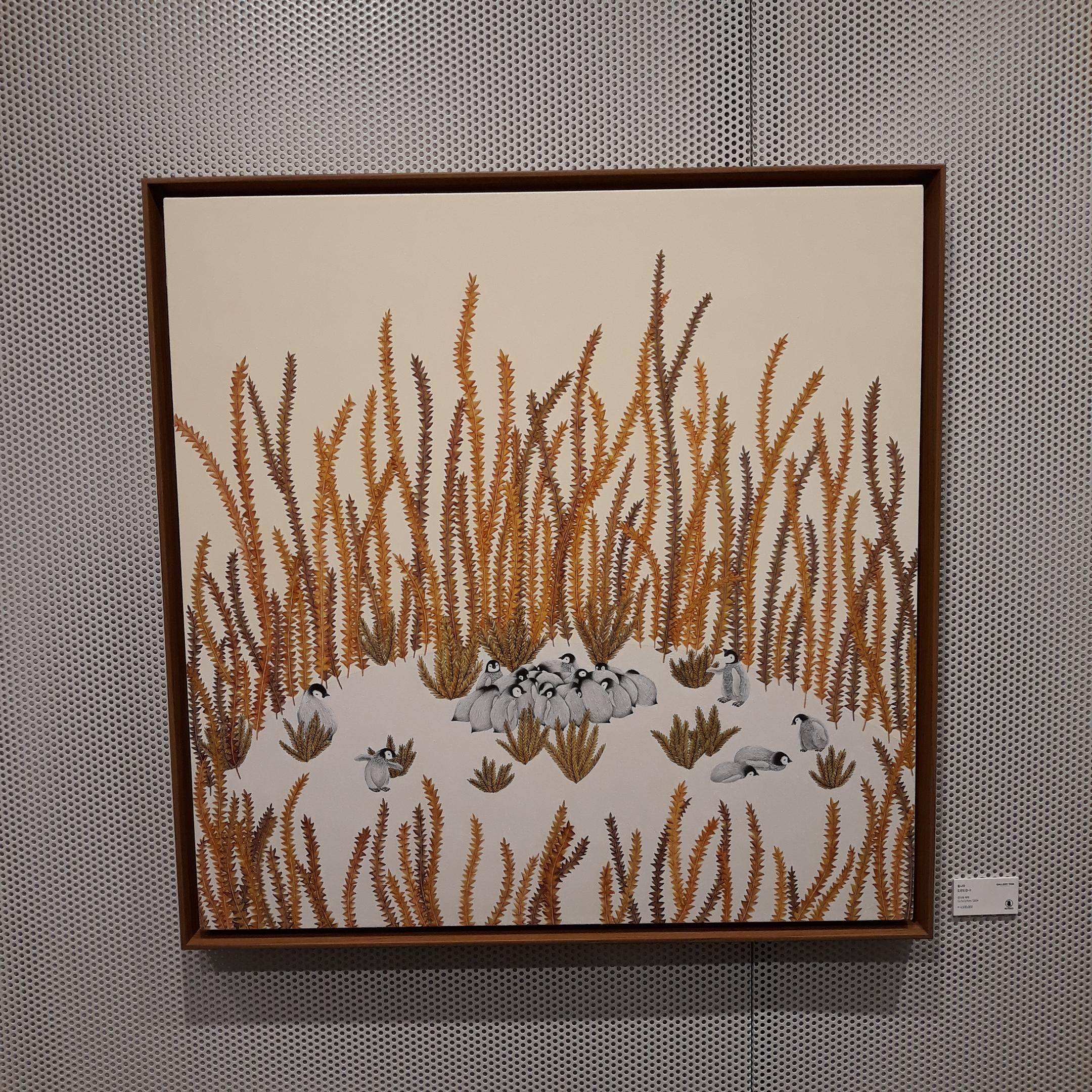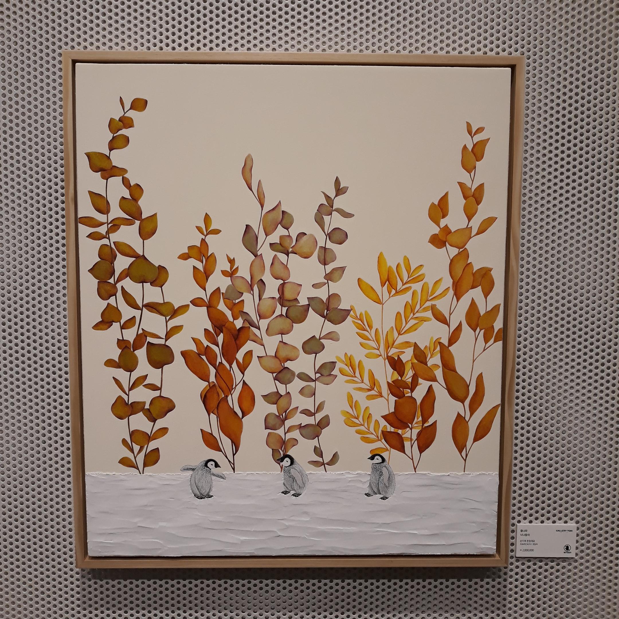 작품들 커다랗고 탐스러운 꽃송이들과 그 밑을 아장아장 걷고 있거나 서로 이야기를 나누는 듯한 펭귄들이 보였습니다. 모두 <Colors of Autumn>이라는 제목의 황나라 작가님의 작품들이었습니다.