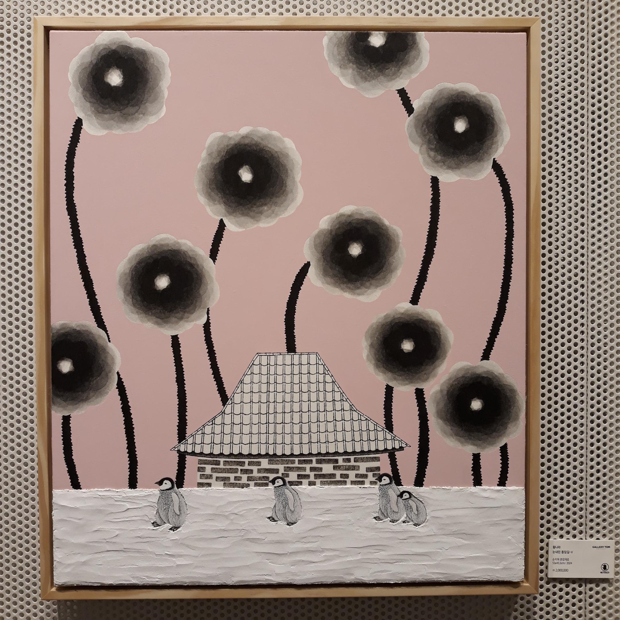 눈내린 돌담길 <눈 내린 돌담길-V>라는 제목의 그림 작품은 또 어떤가요? 돌담길도 정겹고 그 앞을 지나가는 펭귄들도 귀여웠으며 돌담길 집 뒤의 커다란 꽃송이들이 정말 인상적이었습니다.