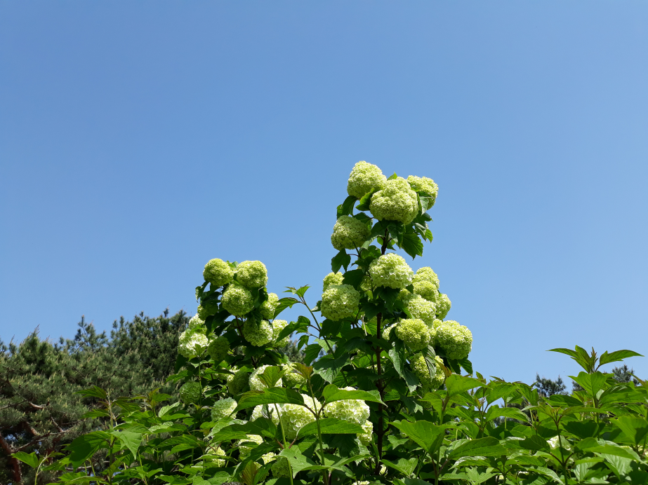 연초록 꽃들 불두화는 꽃이 처음 필 때는 연한 초록색입니다. 그러다가 꽃이 활짝 피면 하얀색이 됩니다. 그렇다면 꽃이 질 무렵이면 어떤 색이 되는 것일까요? 누런색으로 변한다고 합니다.